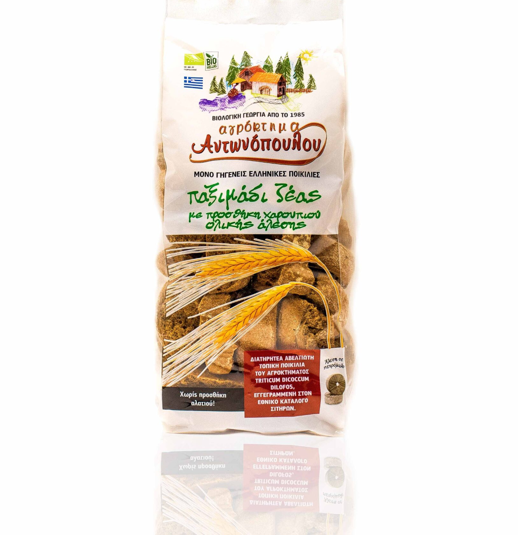 Παξιμάδι ζέας με προσθήκη χαρουπιού ολικής άλεσης βιολογικής γεωργίας, φτιαγμένο από την αβελτίωτη τοπική ποικιλία Triticum dicoccum “Dilofos”, εγγεγραμμένη στον Εθνικό Κατάλογο Σιτηρών. Δεν περιέχει αλάτι. Κατάλληλο για vegan και χορτοφάγους.